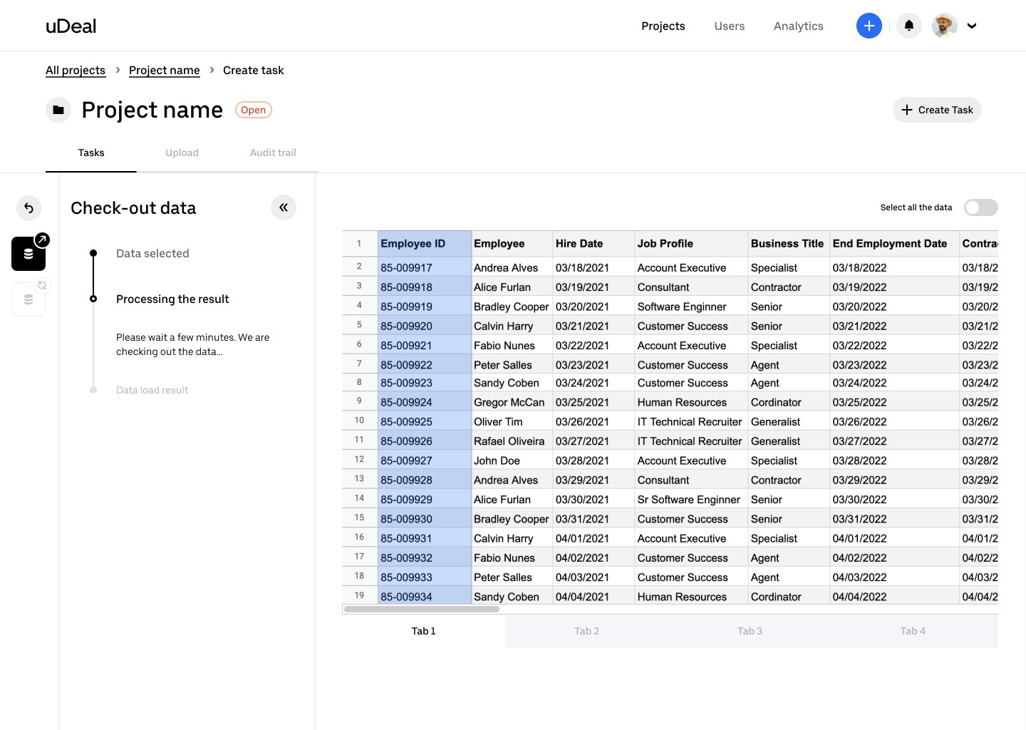 At this stage, the person responsible for the process can request or input data using uDeal’s synchronization feature. This ensures greater security by updating a single, centralized database. The system handles data check-in and check-out to maintain integrity and prevent conflicts during the update process.