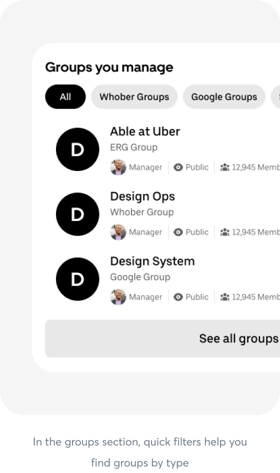 In the groups section, quick filters help you find groups by type